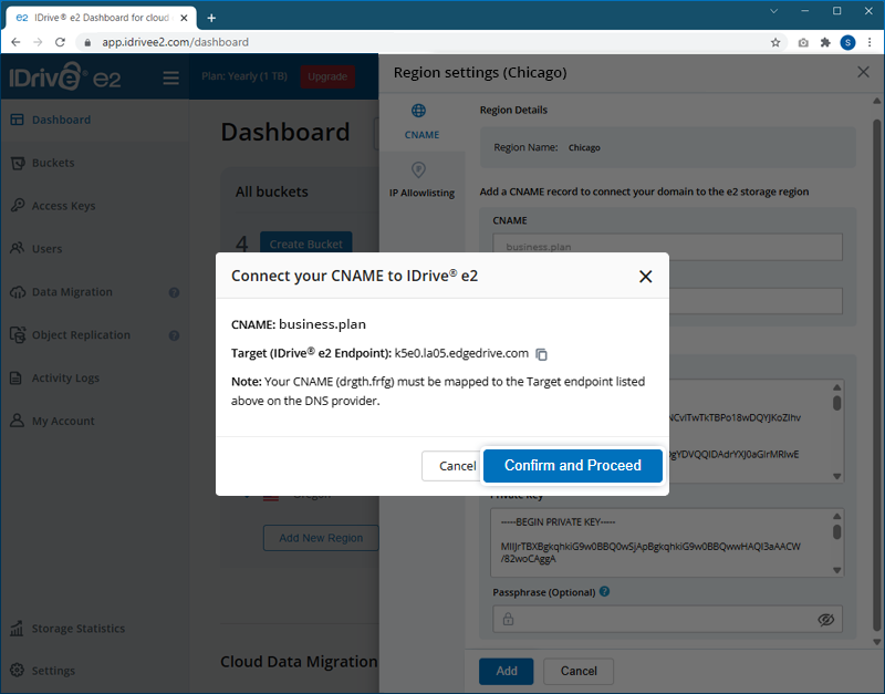 8. Ensure the CNAME is mapped to the Target IDrive® e2 endpoint on the DNS provider, and provide your confirmation to proceed.